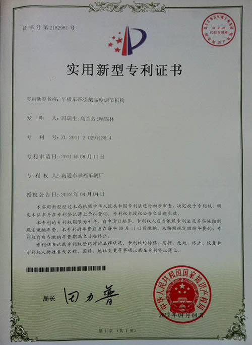 平板車(chē)牽引架高度調(diào)節(jié)機(jī)構(gòu)專(zhuān)利證書(shū)